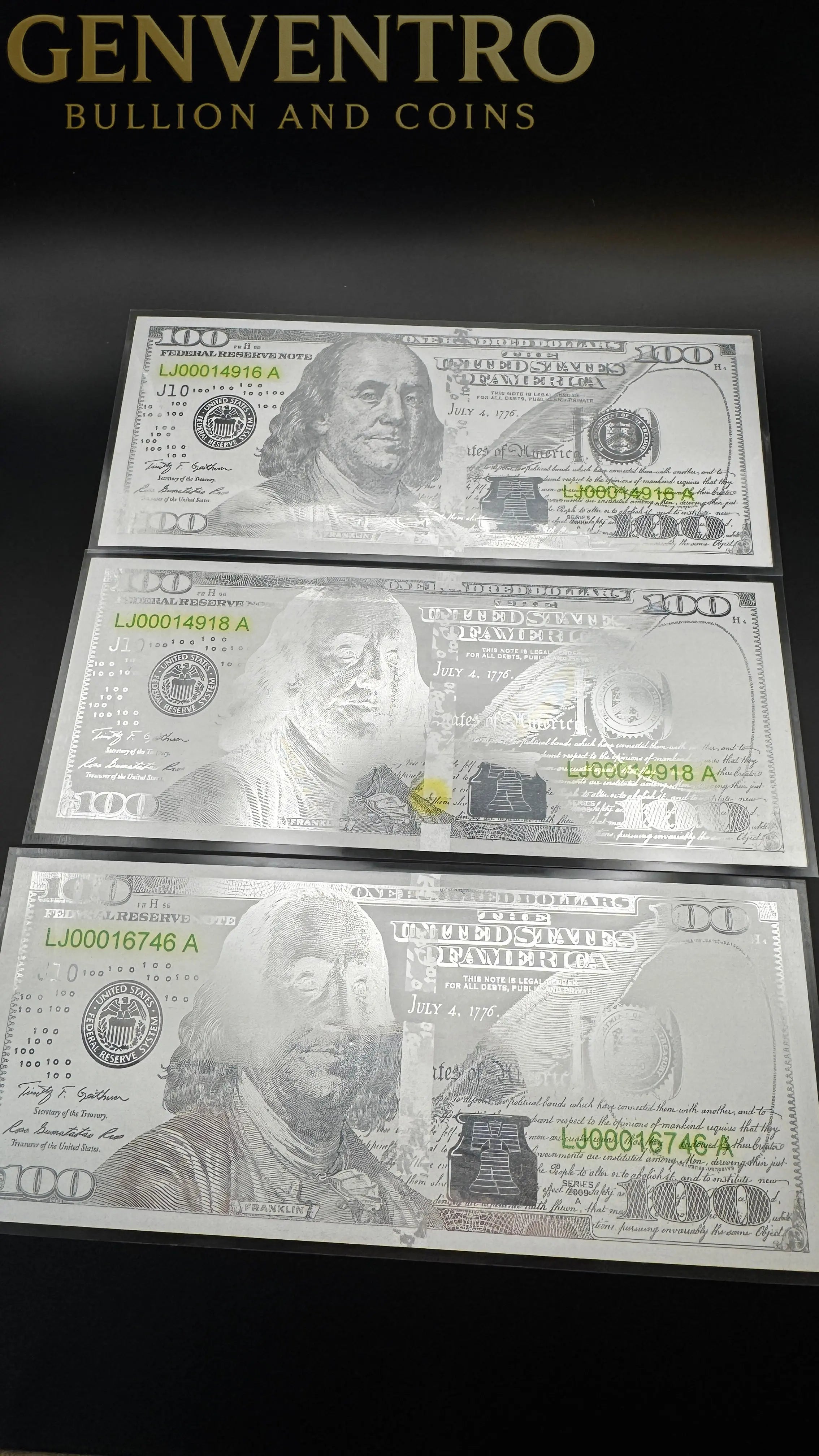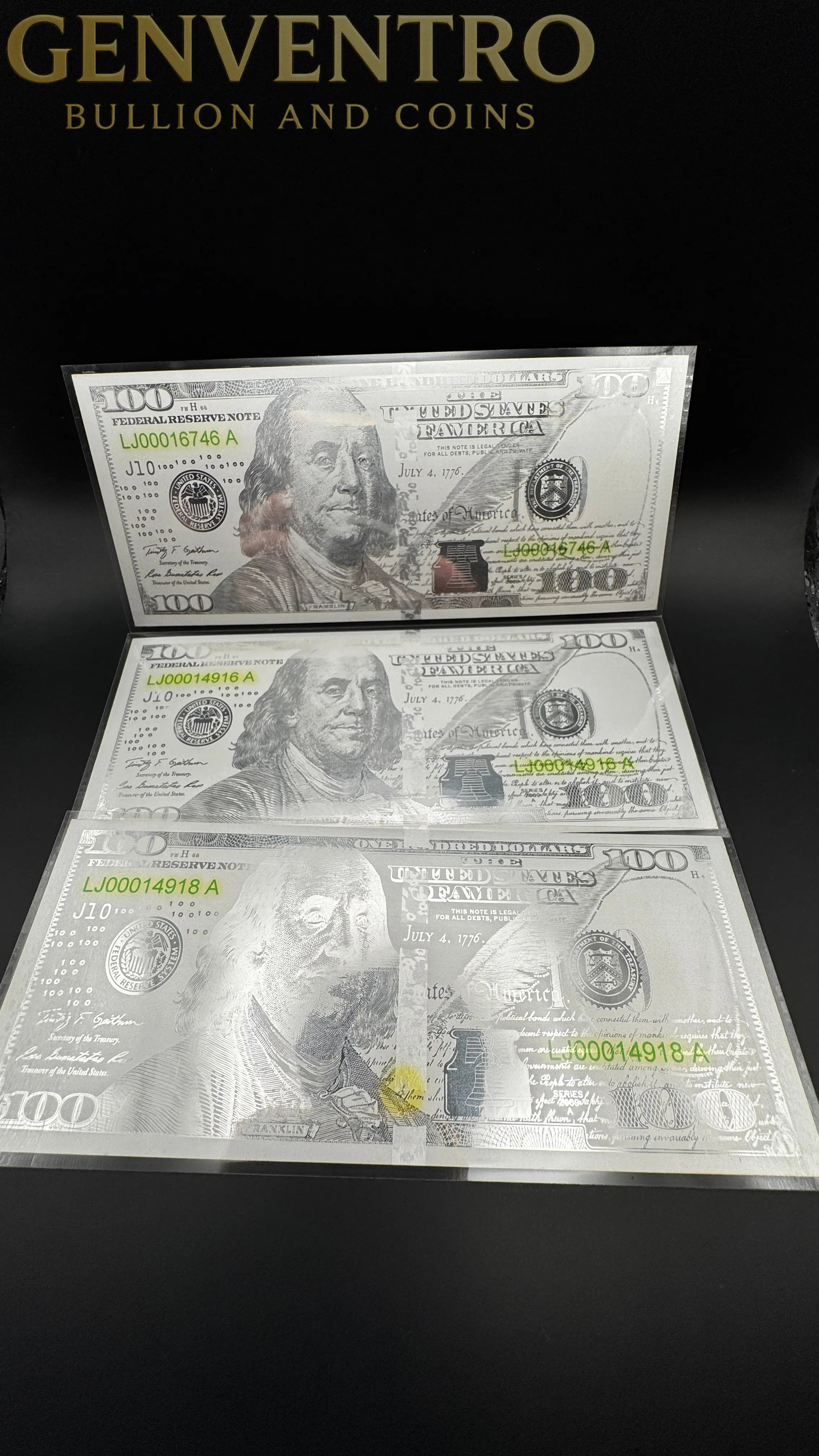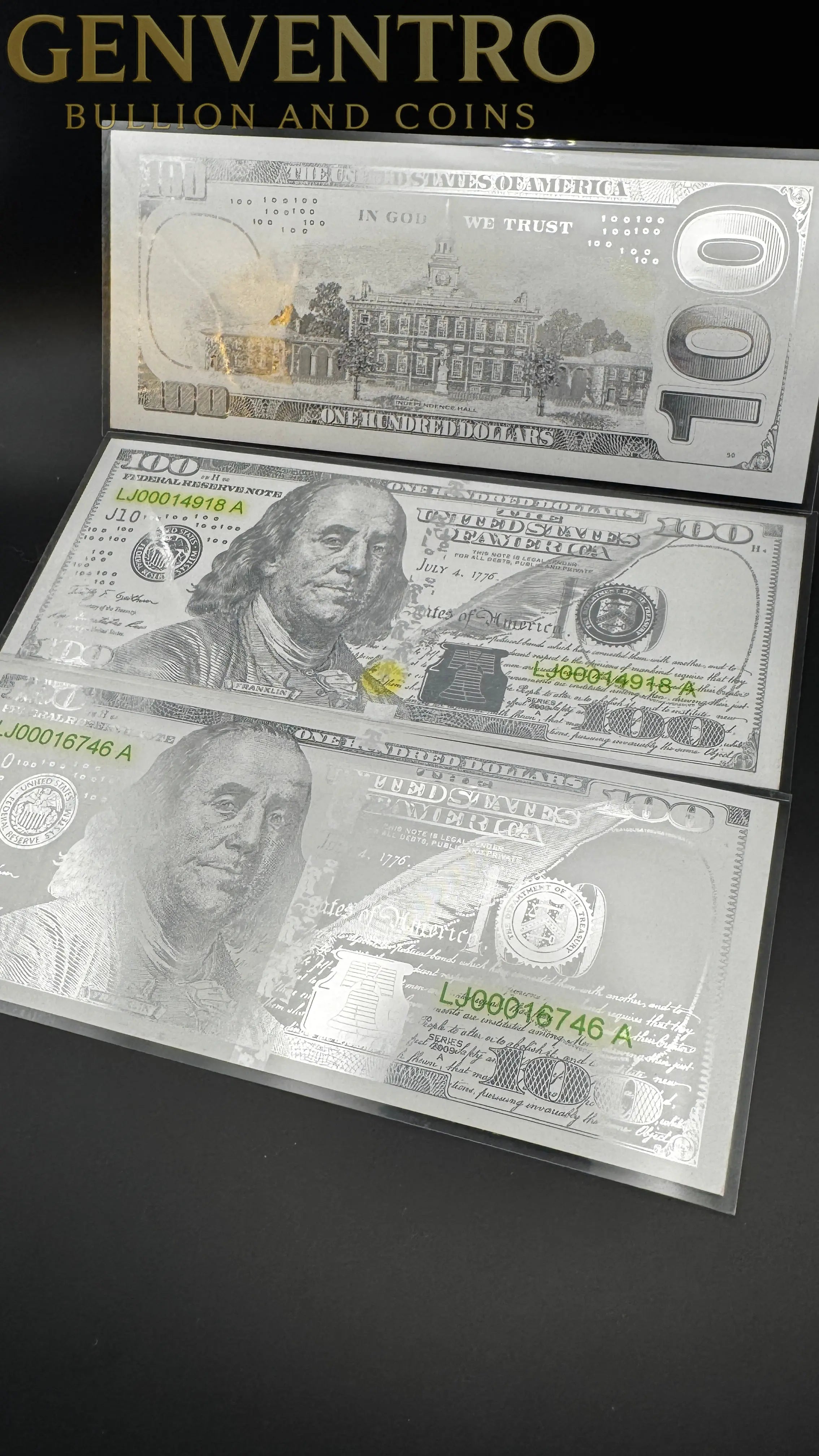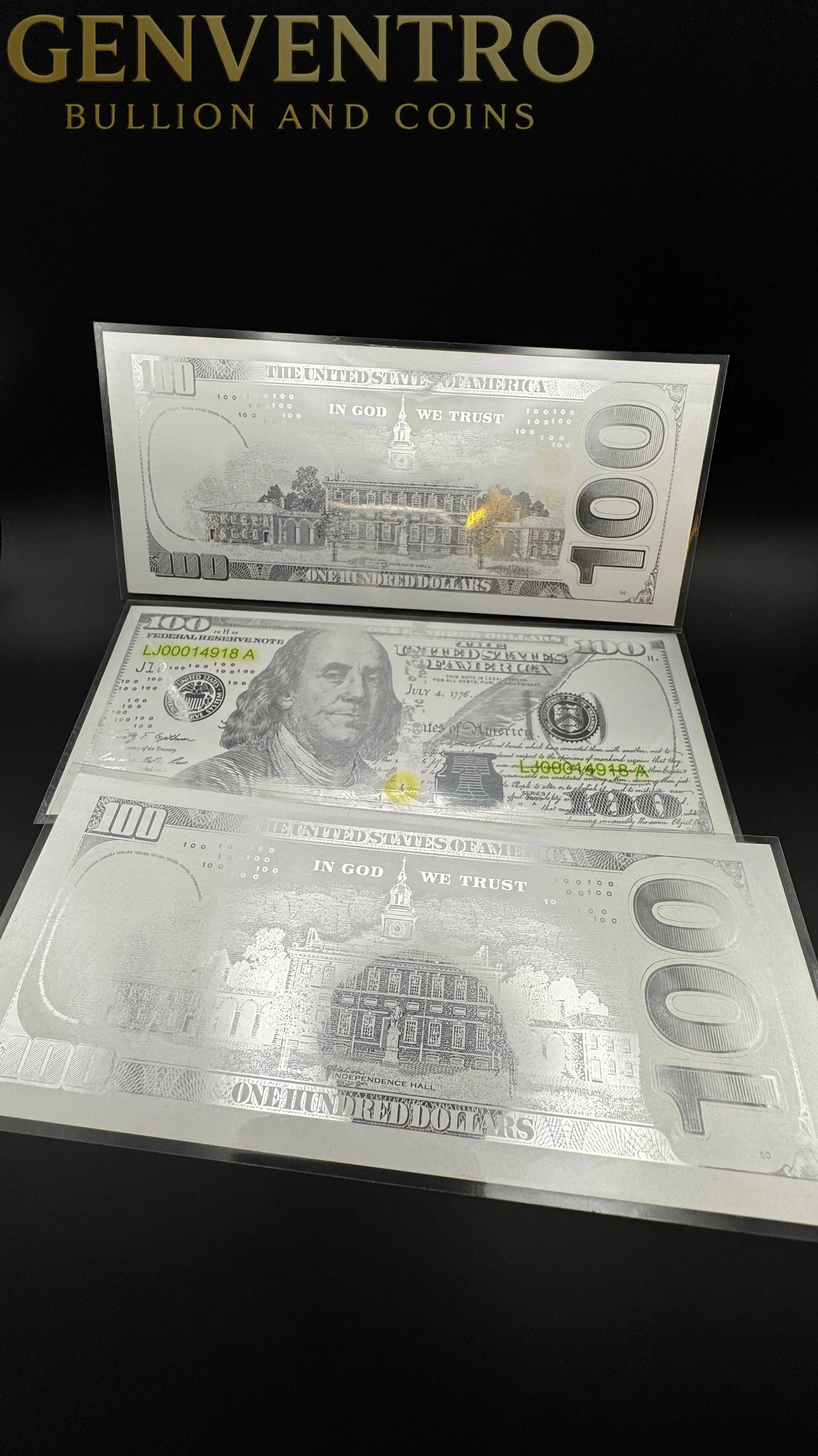 U.S. $100 silver Commemorative Silver Currency notes are a rare and valuable collectible item featuring a denomination of $100. This uncirculated silver note, minted in the United States, holds a high purity of .999 pure silver.It is a unique piece that would be a prized addition to any coin collector's inventory, commemorating a special event or gift.