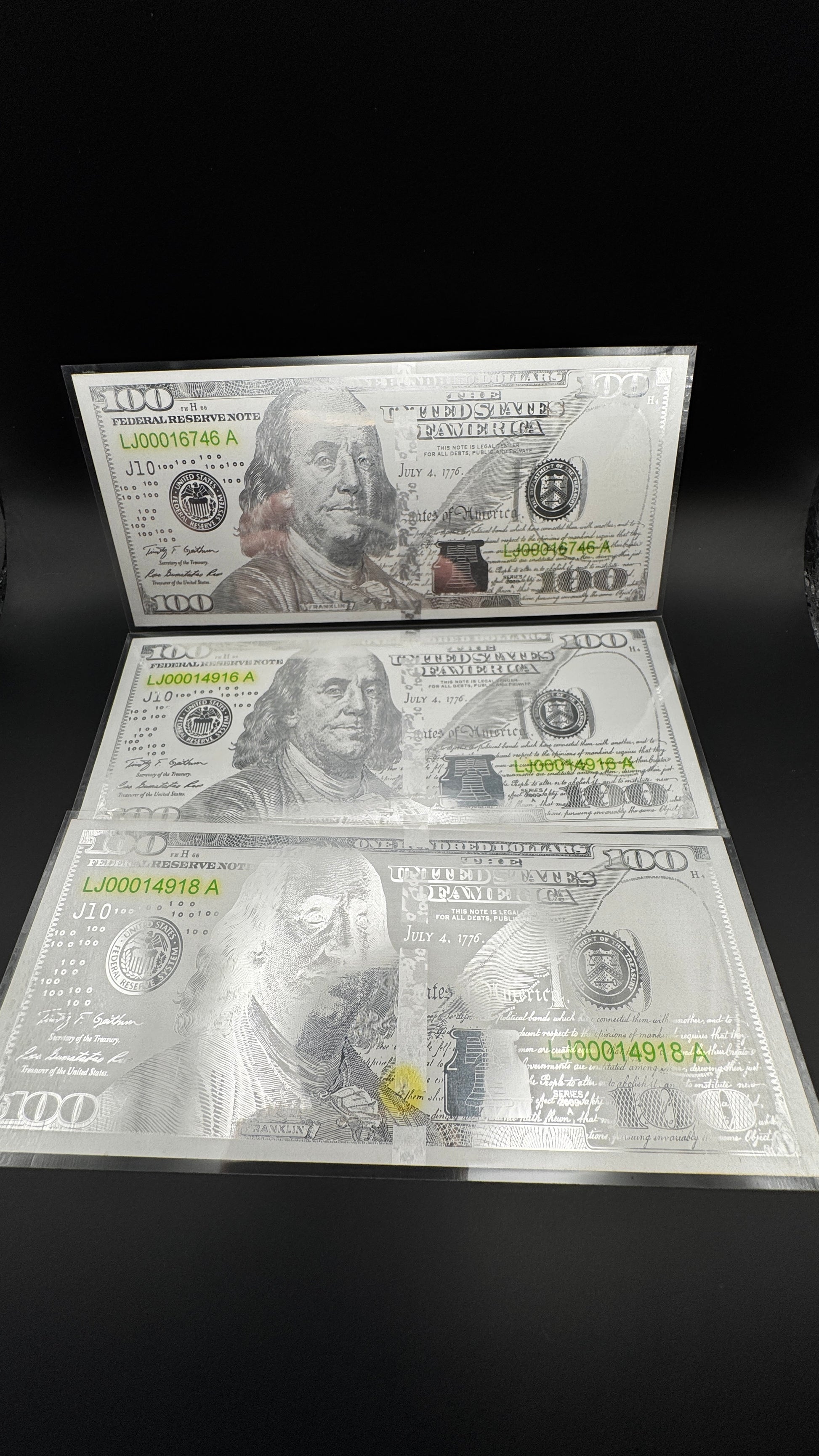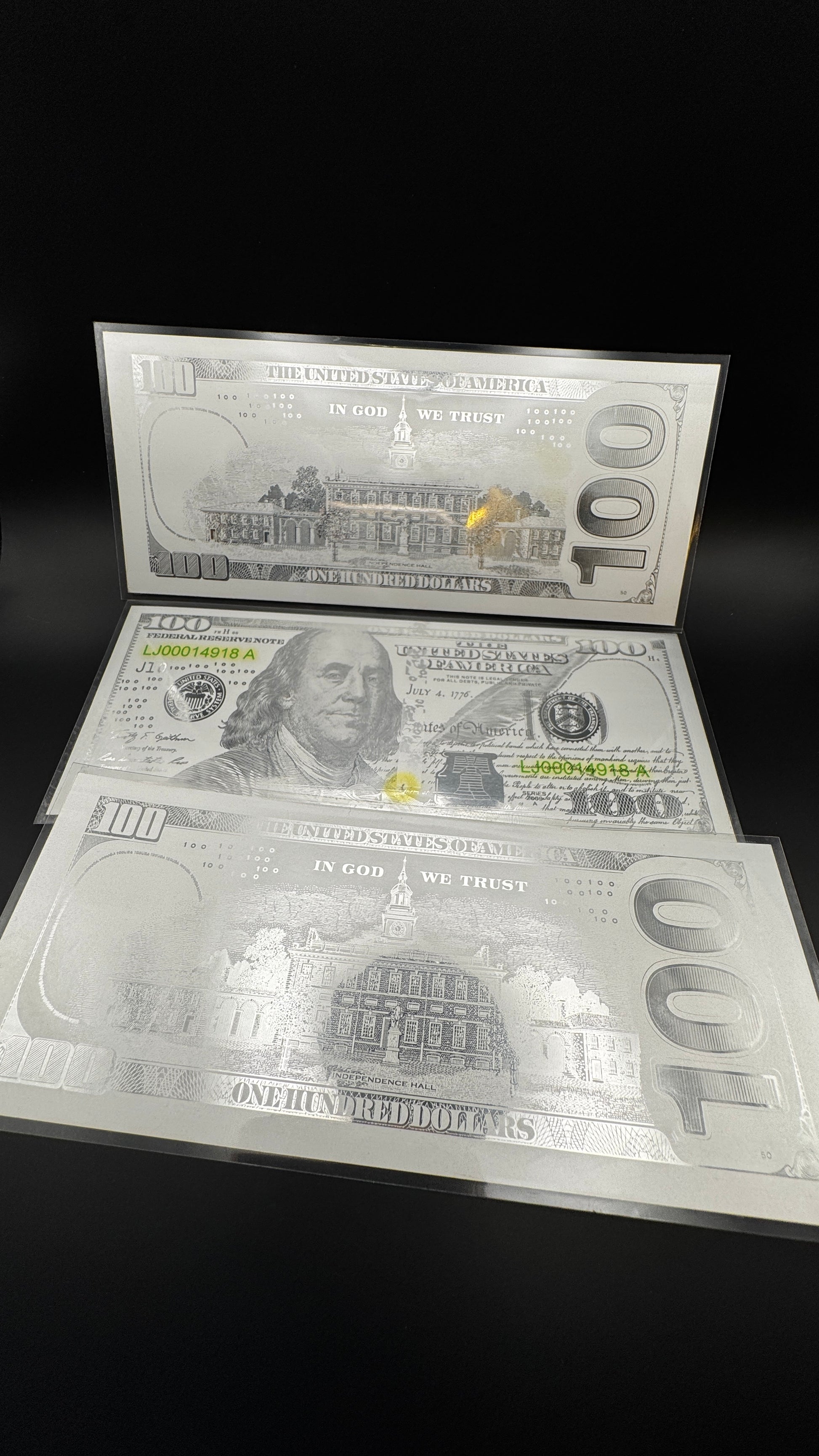 U.S. $100 silver Commemorative Silver Currency notes are a rare and valuable collectible item featuring a denomination of $100. This uncirculated silver note, minted in the United States, holds a high purity of .999 pure silver.