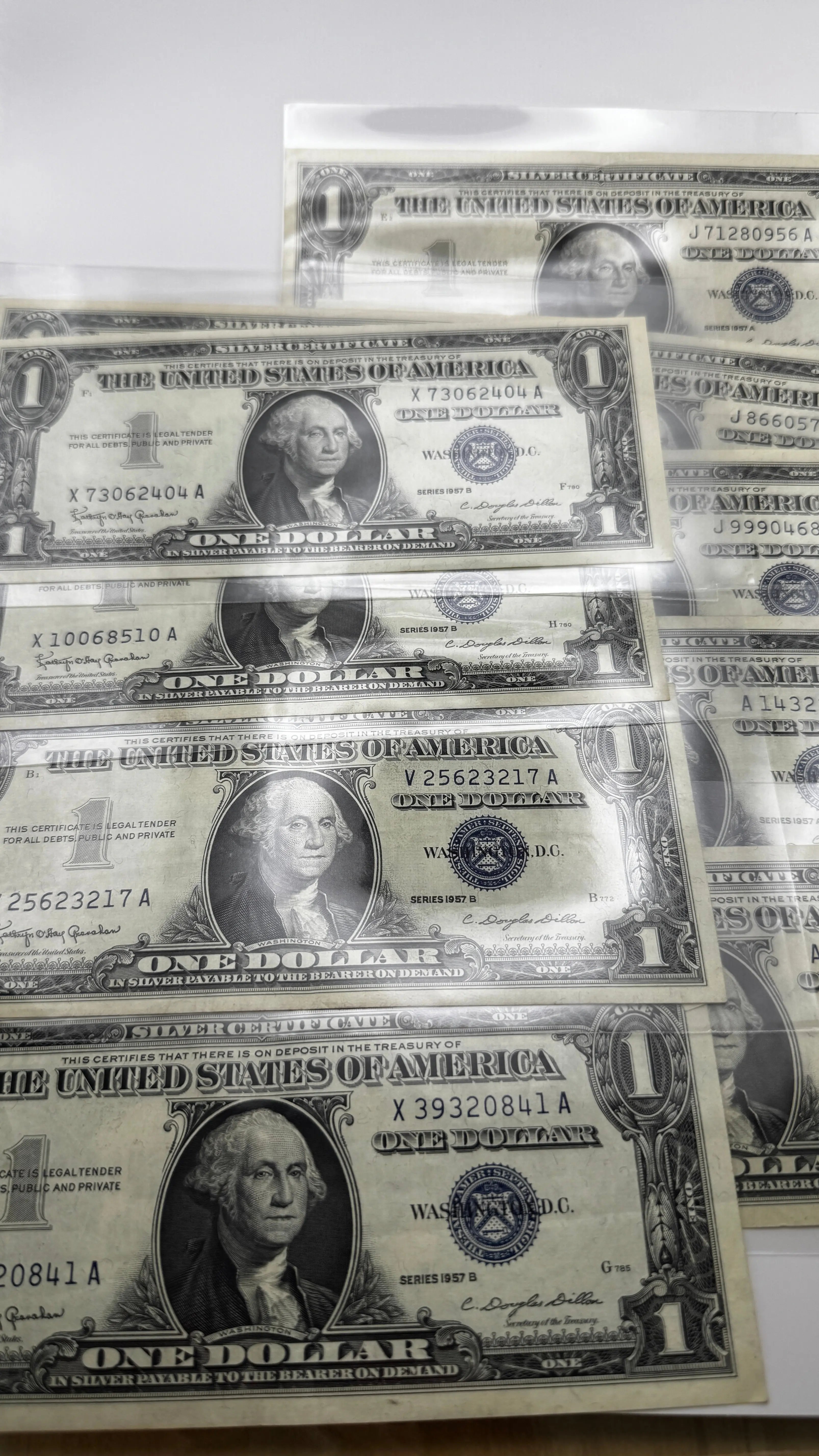 1957 Blue Seal $1 Silver Certificates - plain 1957, and 1957A / 1957B years. Sold in lots of 1 bill each, randomly selected unless otherwise requested.Condition (Grade):