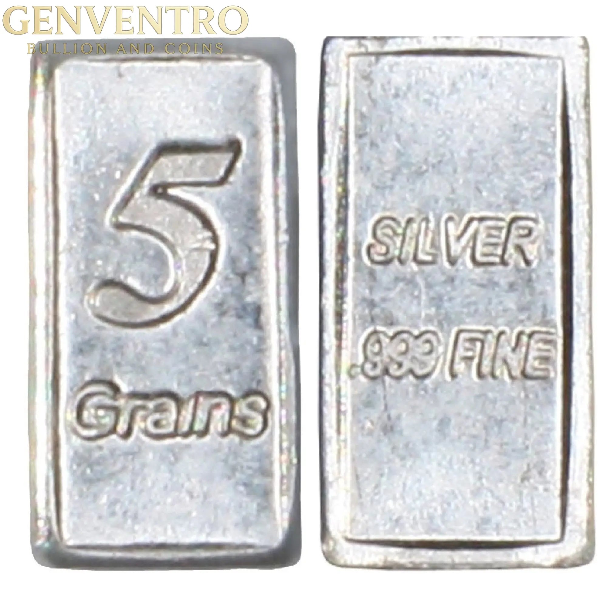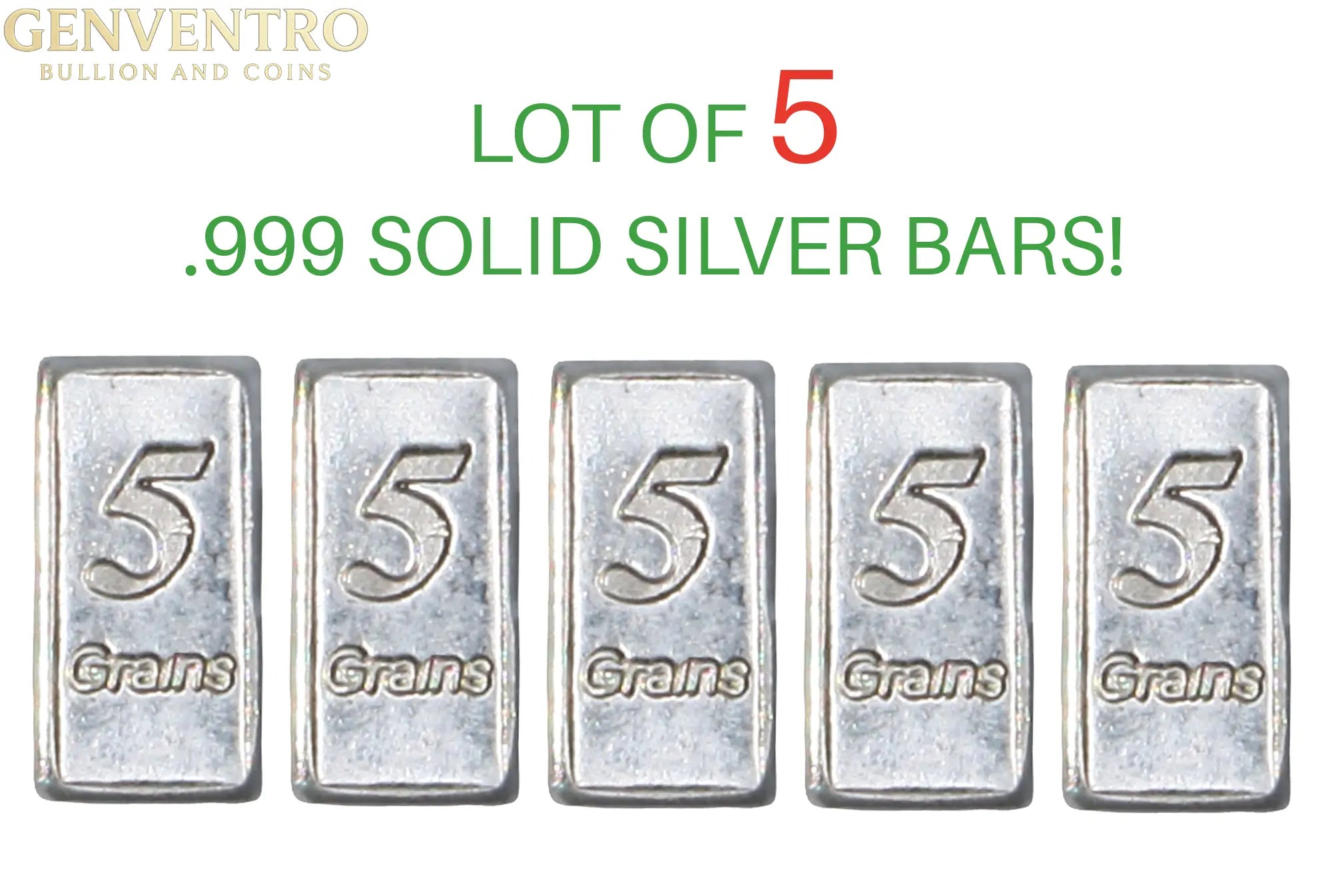 Set of 5 Pure Fine Silver Bars .999 Silver, 5 Grain Each Bar x 5