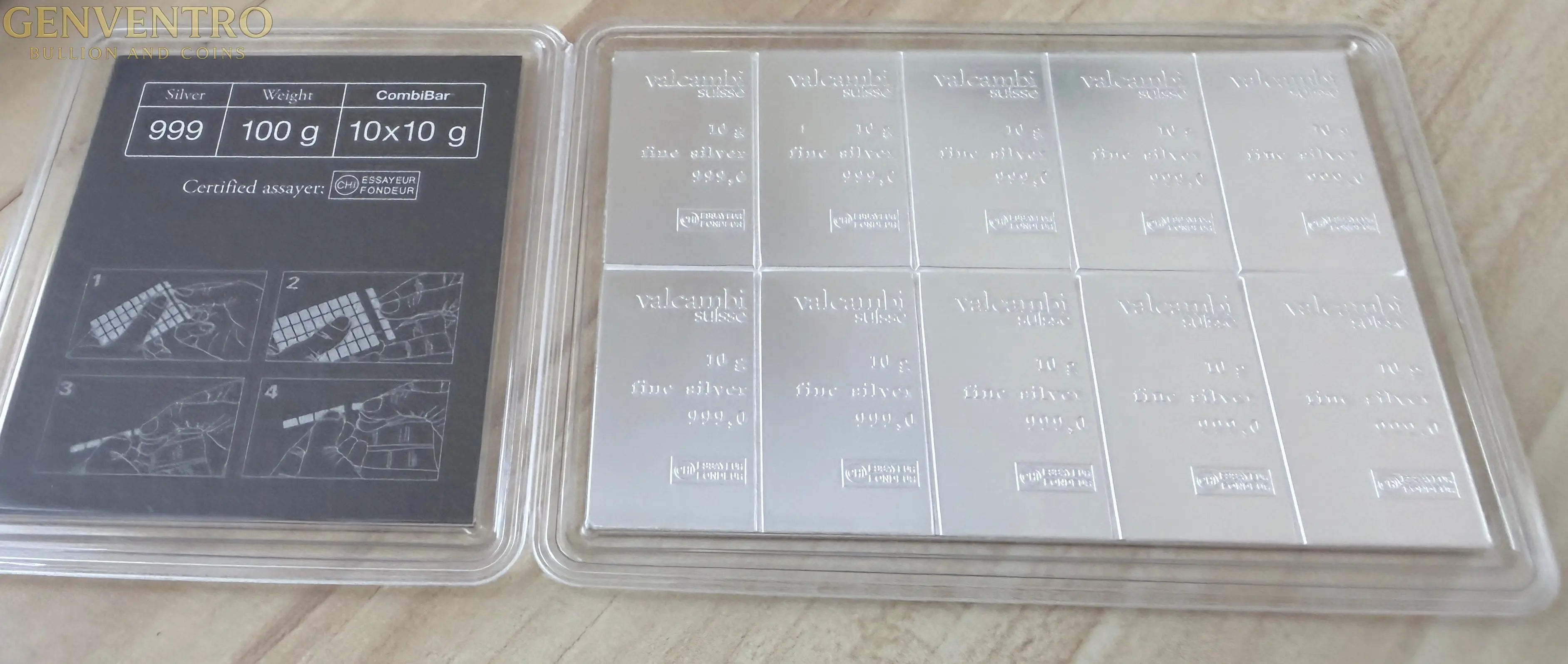100 Gram Valcambi 10 x 10 Gram Silver CombiBar - Brand New In Assay Card